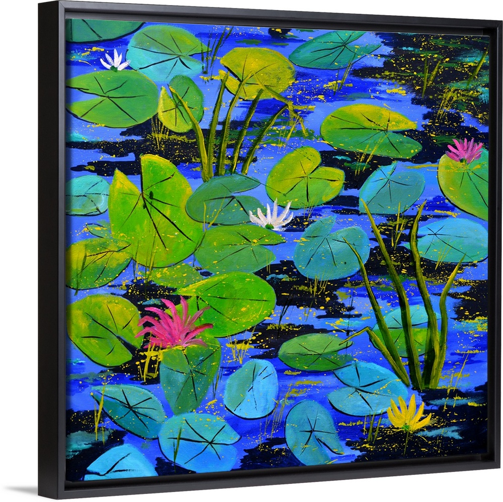 <p>Square painting of blue and green water lilies with flower blooms and small speckles of paint overlapping.</p>