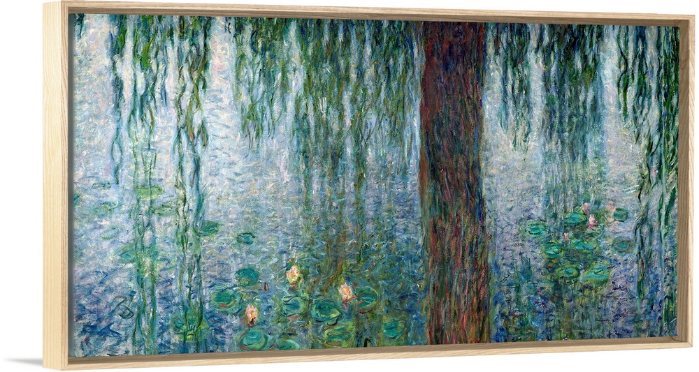 <p>Detail of an Impressionist painting of willow branches dipping into water covered with lily pads.</p>