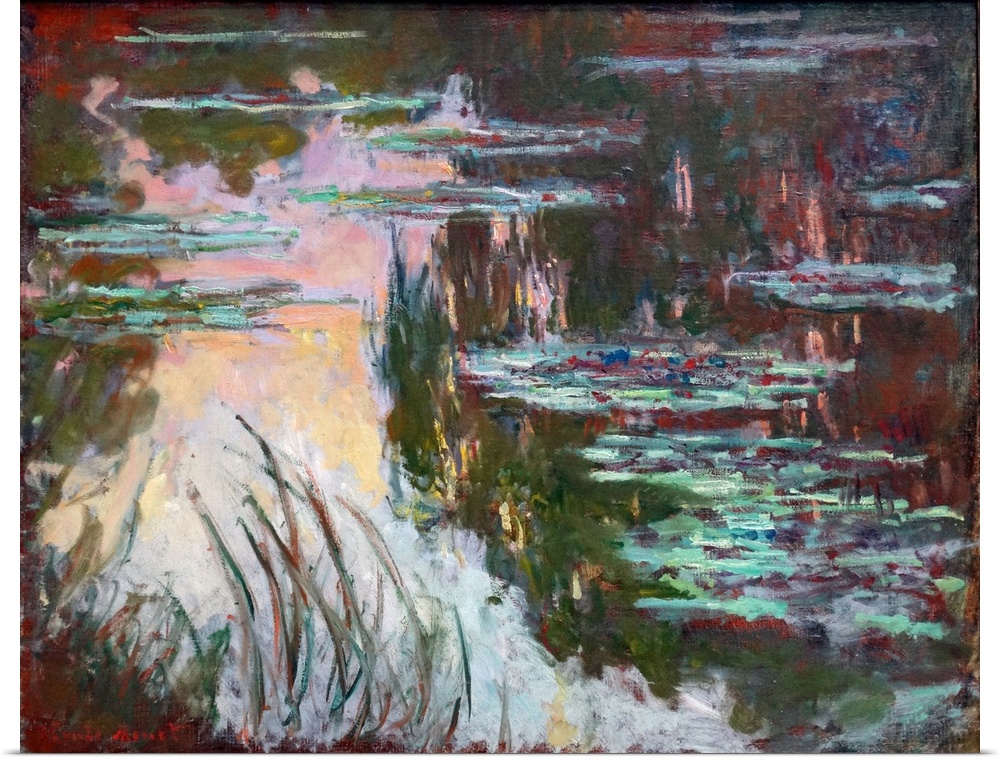 <p>Painting titled 'WaterLilies, Setting Sun' by Claude Monet, founder of French Impressionist painting. Dated 1907.</p>