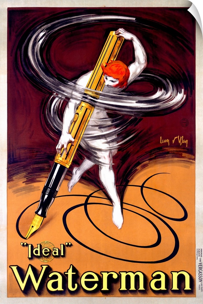 <p>This vintage art piece shows a man using a life size men twirling designs. The background contains warmer tones and the text "Ideal Waterman" shown at the bottom.</p>