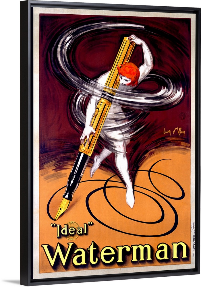 <p>This vintage art piece shows a man using a life size men twirling designs. The background contains warmer tones and the text "Ideal Waterman" shown at the bottom.</p>