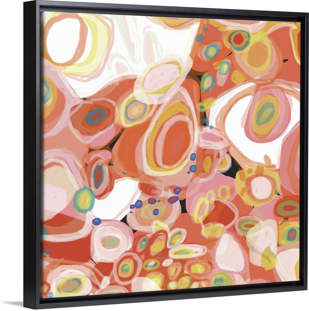 <p>A series of layered shapes in pink, yellow and orange with the feel of water gently flowing over each delicate shape. The calm blue and green tones make this piece a great fit for a living room, bedroom, office or lobby and for hospitality as well.</p>