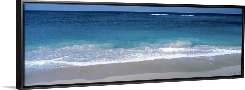 <p>Panoramic picture of waves coming up on the white sandy beach in the Caribbean.</p>