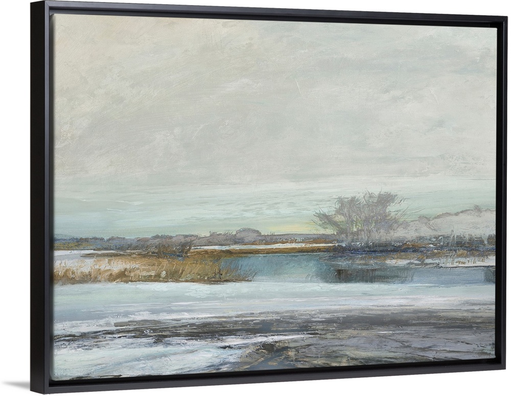 <p>Abstract landscape artwork of the edge where land meets water in subdued colors.</p>