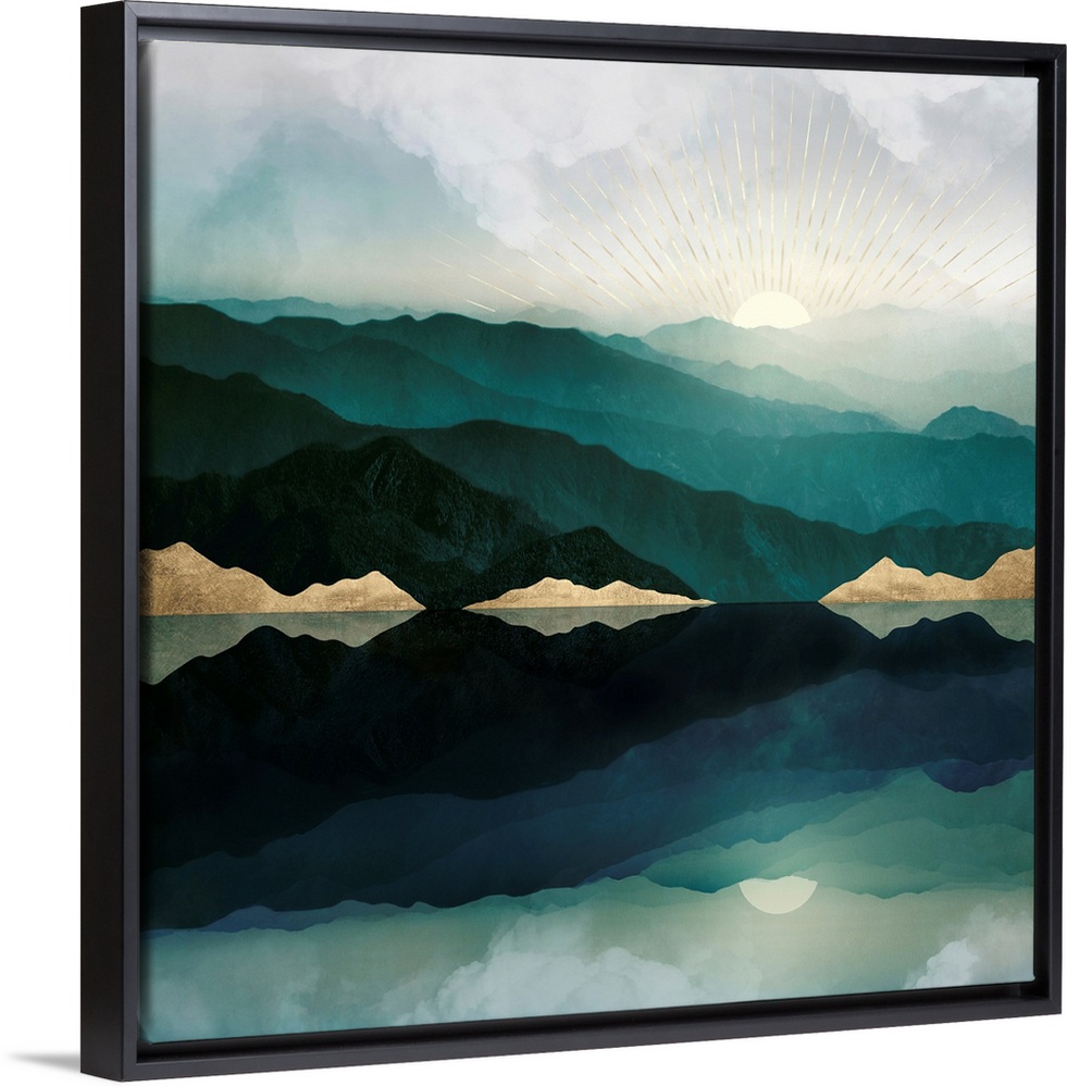 <p>Abstract landscape with reflection featuring mountains, water, moon, sun, clouds, green and gold.</p>