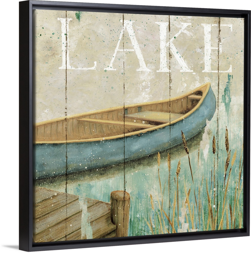 <p>Decorative artwork perfect for the home of a canoe sitting in the water next to a dock with the word "Lake" written up top. The artwork has a wood panel design to it.</p>
