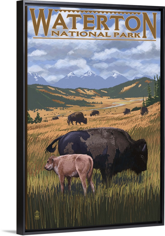 <p>Retro stylized art poster of a mother bison and calf grazing on wide open plains.</p>