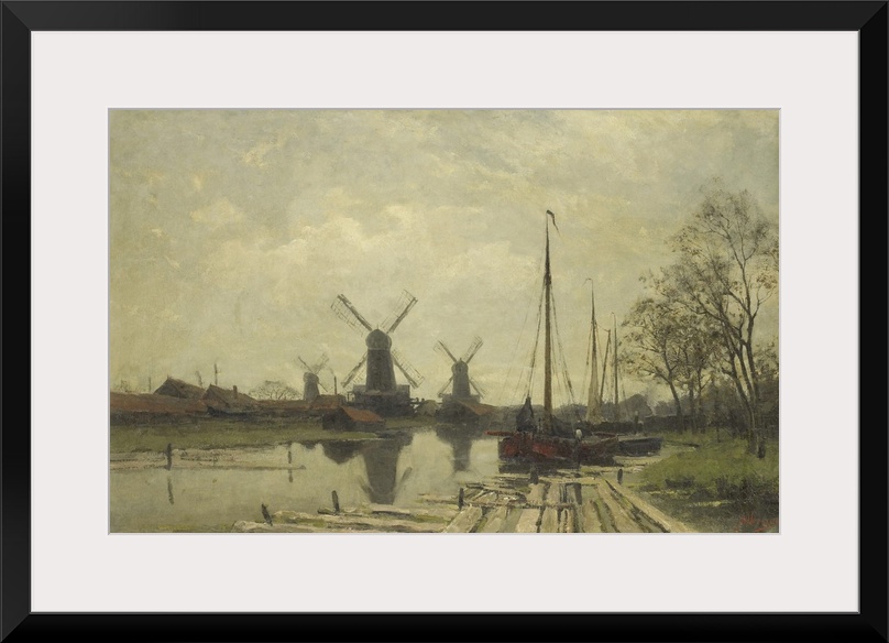 <p>Waterway near the Baarsjes, Amsterdam, by Jan Hillebrand Wijsmullerm, 1880-1901, Dutch painting, oil on canvas. Three windmills near the waterfront.</p>