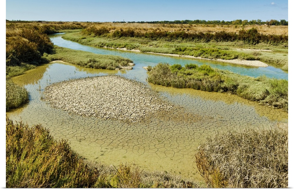 <p>Waterways and cracked mud in the salt marshes of the island's west, near Le Griveau, Ars en Re, Ile de Re, Charente-Maritime, France</p>