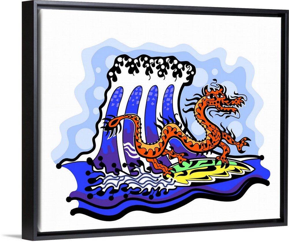 <p>Contemporary artwork of a dragon surfing a big wave in the ocean in a colorful urban style.</p>