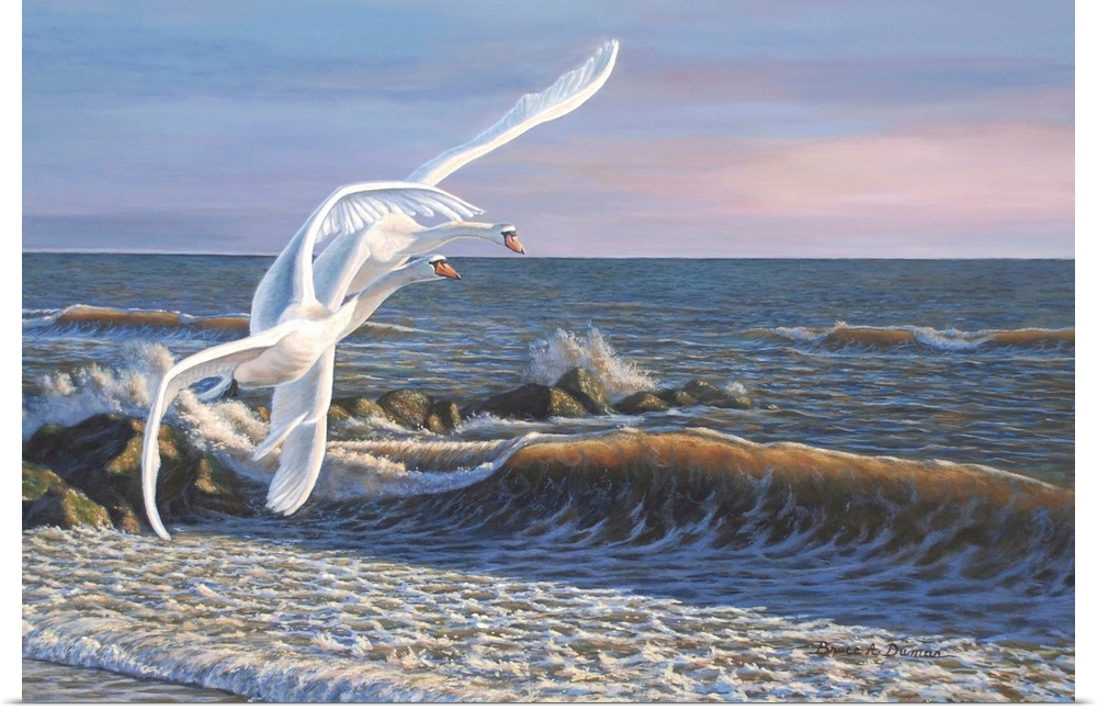 <p>Contemporary artwork of swans flying along the edge of a beach,</p>