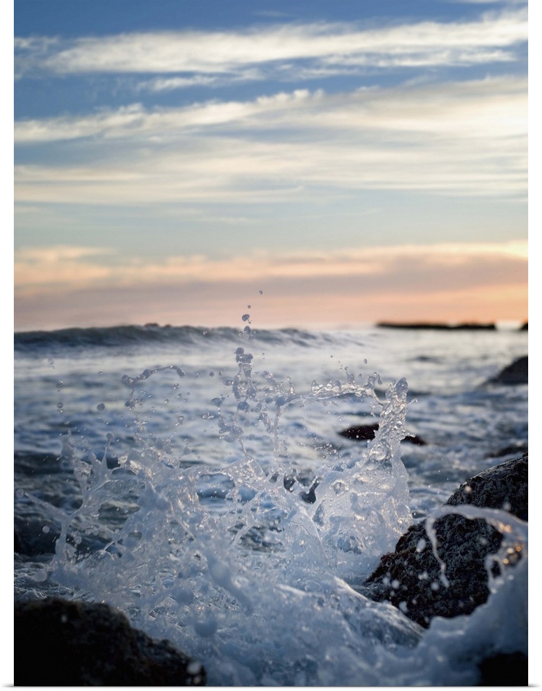 <p>Wave splashing against rocks on shore in the evening. Sun is setting in background.</p>