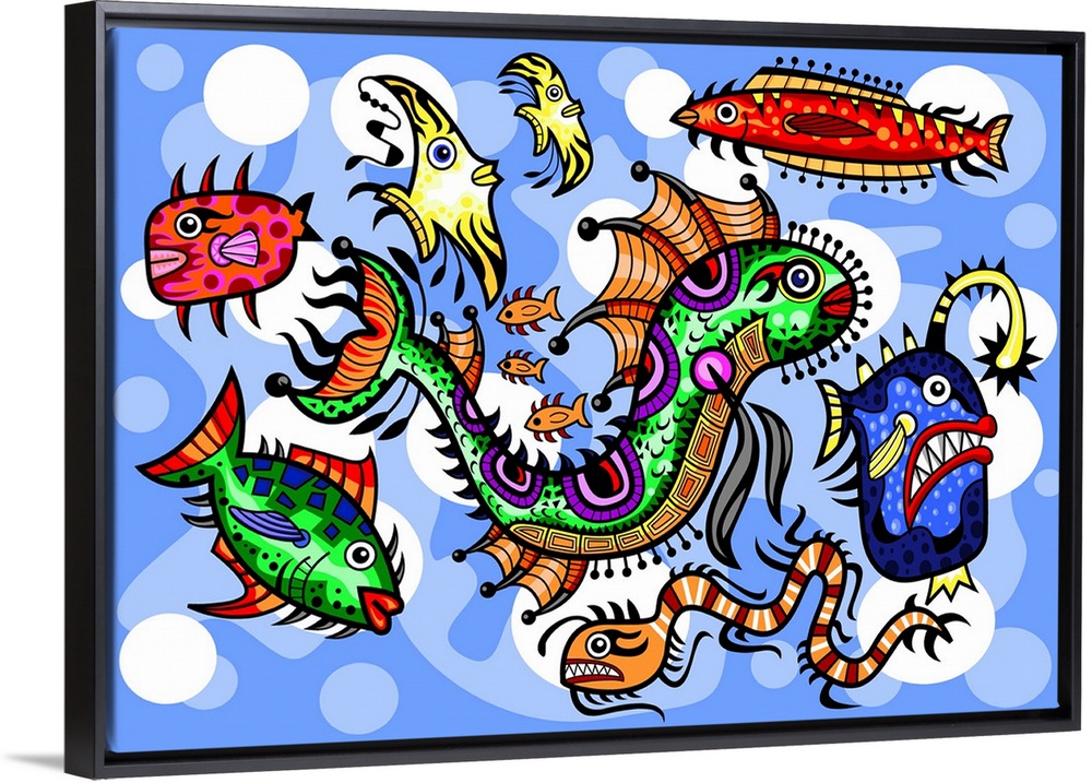 <p>Contemporary children's art of colorful and ornately decorated sea life against a blue bubble background.</p>