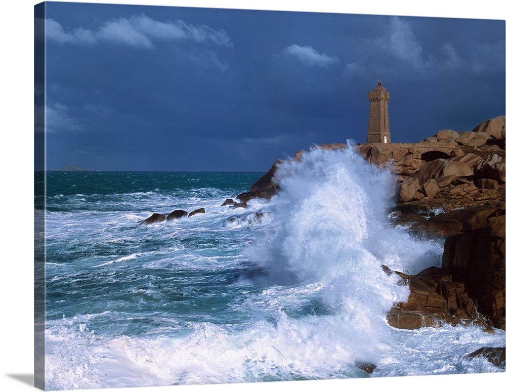 <p>Waves breaking on coast, Ploumanac'h Lighthouse, Pink Granite Coast, Cotes-d'Armor, Brittany, France</p>