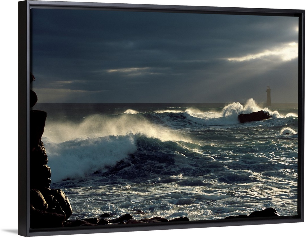 <p>Waves breaking on coast with Nividic Lighthouse in the background, Ushant Island, Finistere, Brittany, France</p>