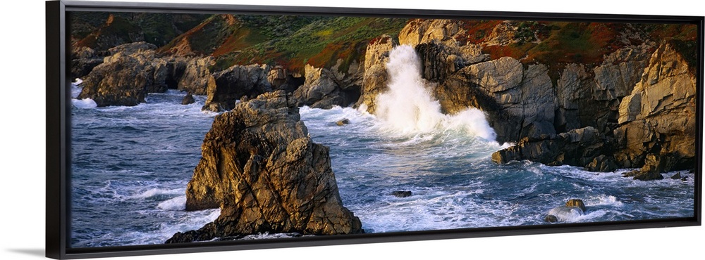 <p>Horizontal photo print of waves crashing into rocky cliffs in the Pacific Ocean and rock formations sticking up out of the water off shore.</p>