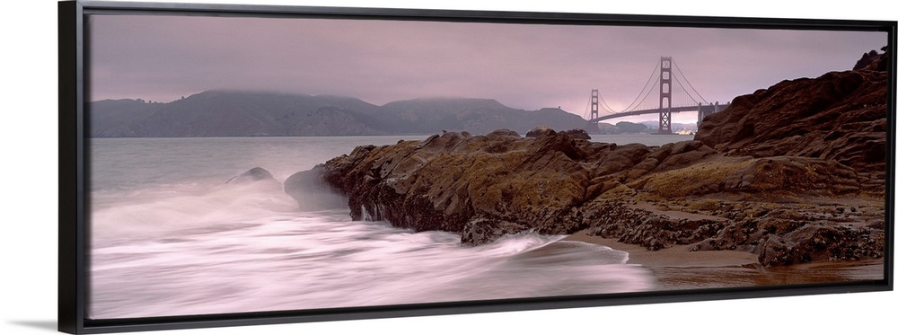 <p>Panoramic photograph shows waves breaking against the rocky shores of Baker Beach in San Francisco, California. In the background you can see the Golden Gate Bridge extending to the clouds of the overcast sky.</p>
