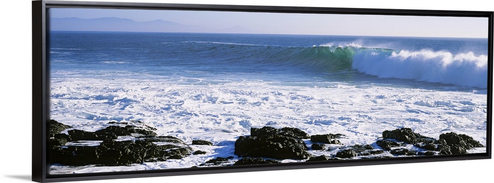 <p>Long image on canvas of big waves crashing onto a rocky shore.</p>