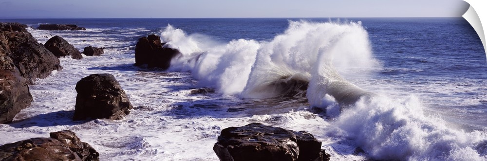 <p>Panoramic photograph of rock cliff line with large boulders and crashing waves under a clear sky.</p>