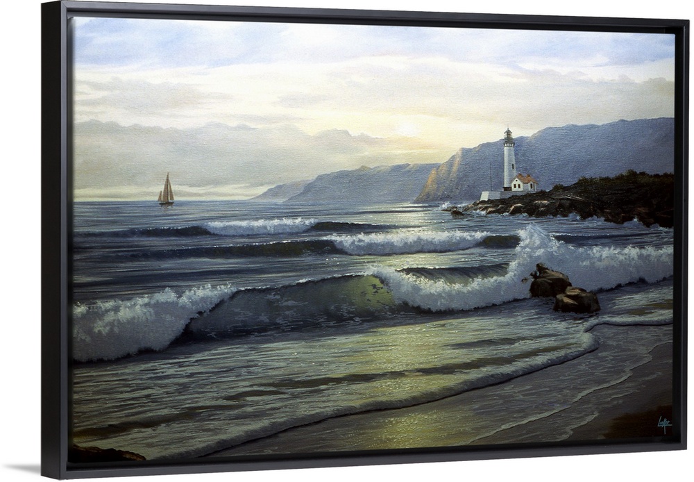 <p>Contemporary painting of waves crashing on the coastline at twilight, with a lighthouse in the distance.</p>