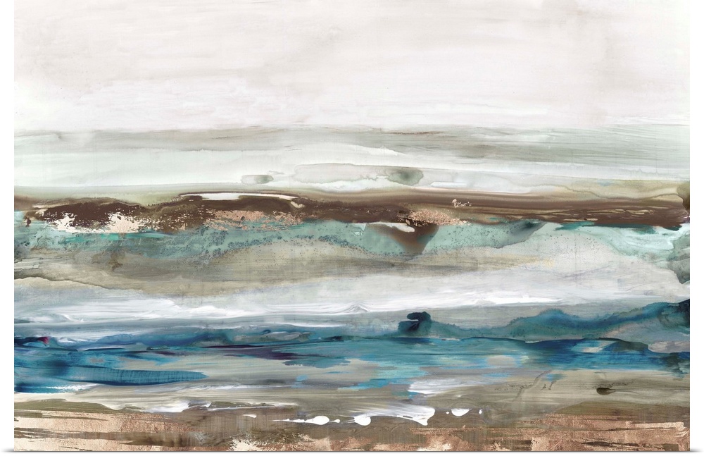 <p>Abstract seascape of waves crashing against a sandy shore.</p>