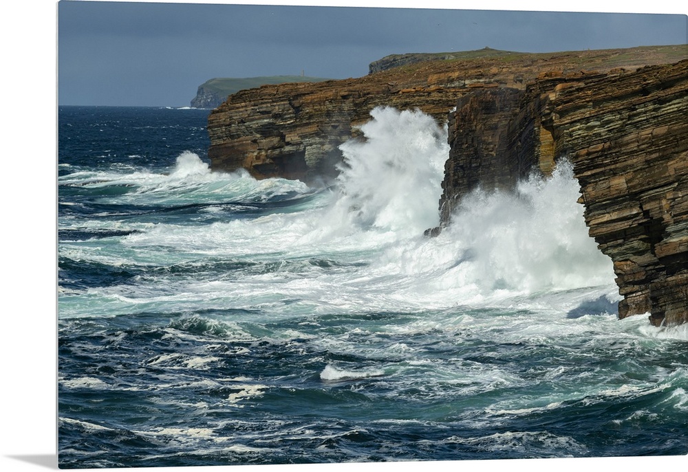 <p>Huge waves crash against the layered cliffs of Yesnaby on the wild west coast of Mainland, Orkney Islands, Scotland. Autumn (September) 2019.</p>