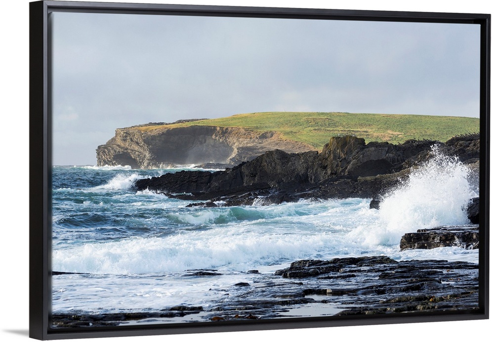 <p>Waves crashing into rocky coast with large grassy hill and cliffs in background, Kilkee, County Clare, Ireland.</p>