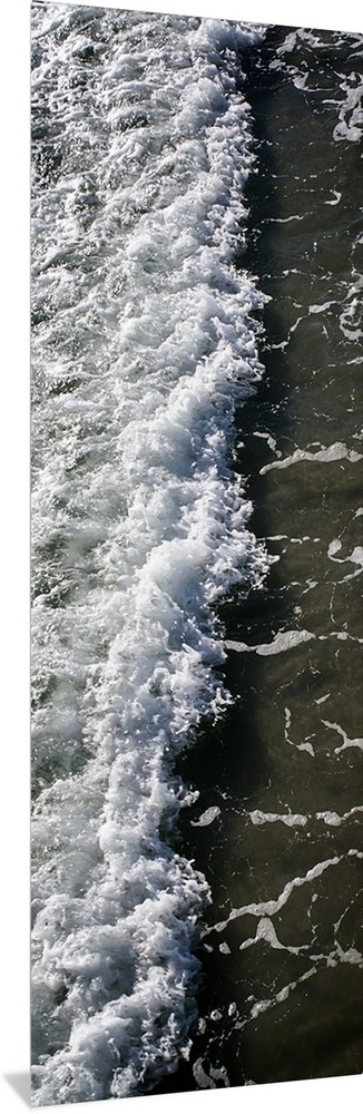 <p>Tall, panoramic photograph of the white water from a crashing wave onto the shore.</p>