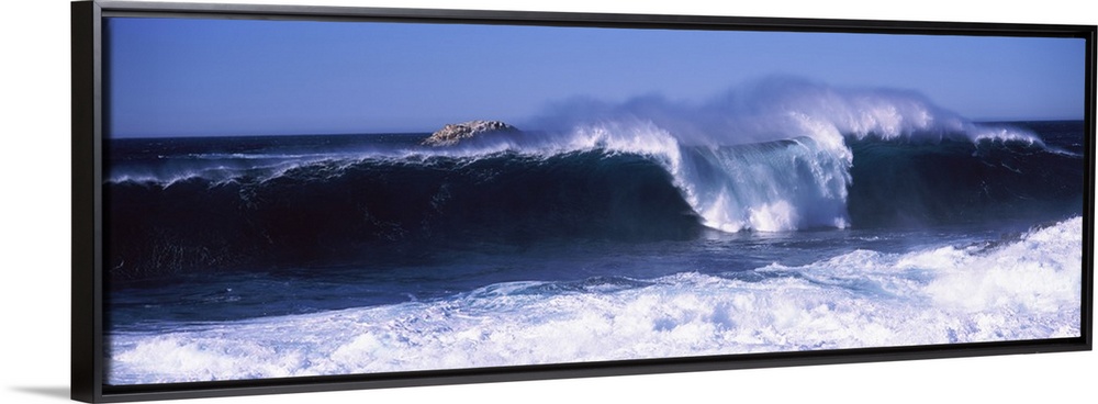 <p>This panoramic beach photograph captures a wave curling and breaking off the shore.</p>