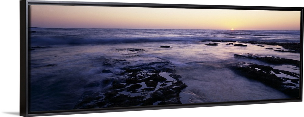<p>Panoramic photograph taken of the ocean as the water flows over rocks and the sun is shown setting on the horizon.</p>