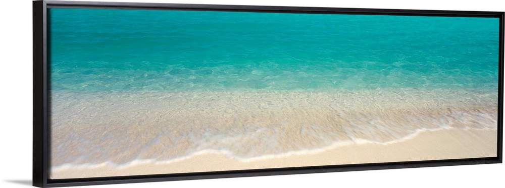 <p>Panoramic photograph displays the clear waters of the Atlantic Ocean gently crashing into the sandy beach of an island.</p>