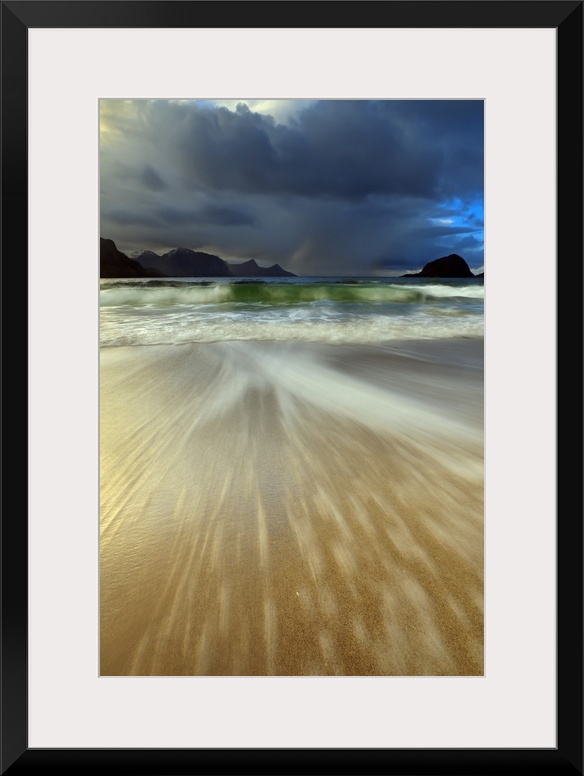 <p>Waves washing back to sea on Haukland Beach, Lofoten, Norway.</p>