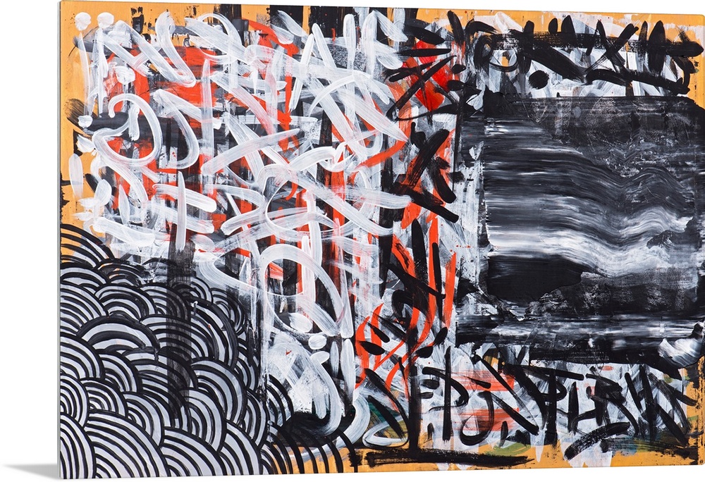 <p>Urban abstract painting in orange, white, and black.</p>