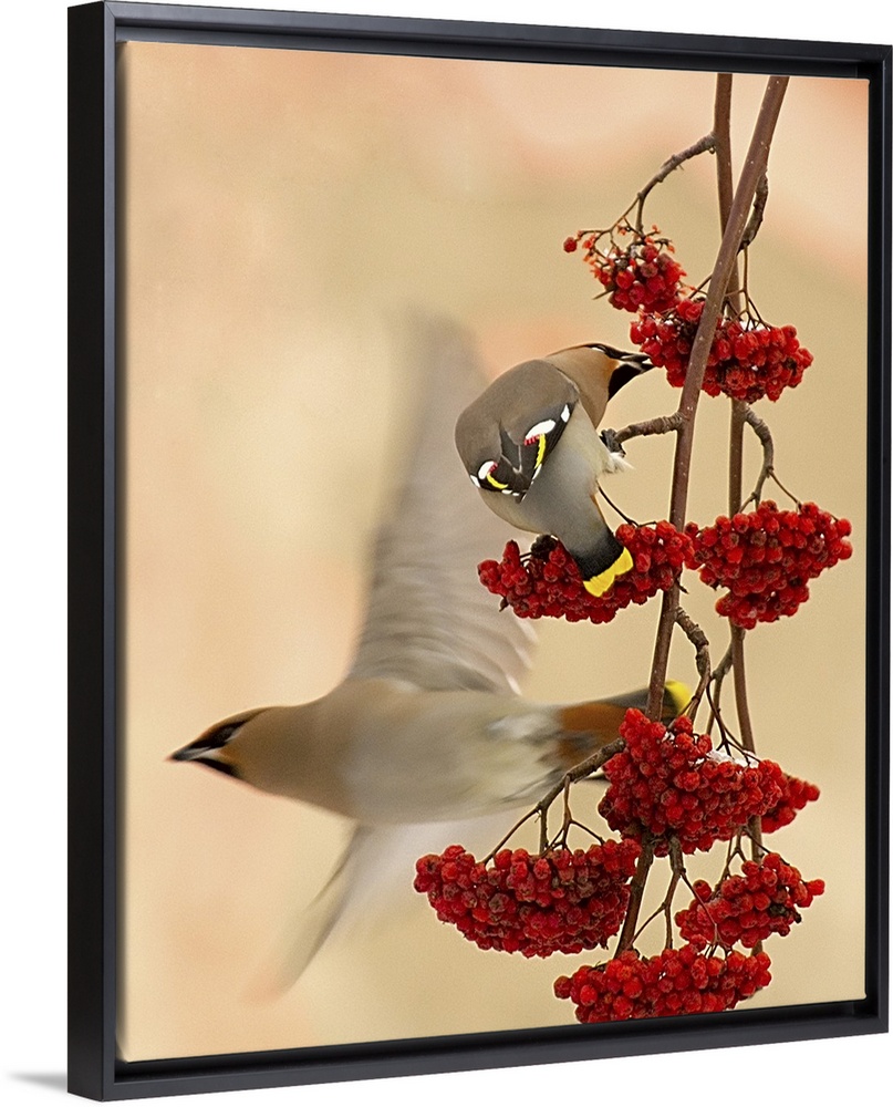 <p>A Cedar Waxwing eats berries hanging from a branch as another flies off.</p>