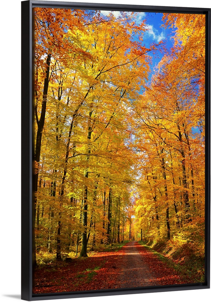 <p>A leaf-covered road cuts through a forest of autumn-colored trees, contrasting sharply with the bright blue sky.</p>