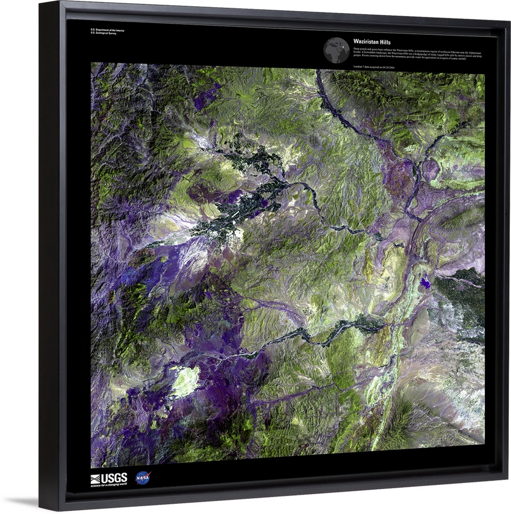 <p>Deep purple and green hues enhance the Waziristan Hills, a mountainous region of northwest Pakistan near the Afghanistan border. A formidable landscape, the Waziristan Hills are a hodgepodge of steep, rugged hills split by narrow passes and deep gorges. Rivers coursing down from the mountains provide water for agriculture in a region of scanty rainfall. April 28, 2001.</p>