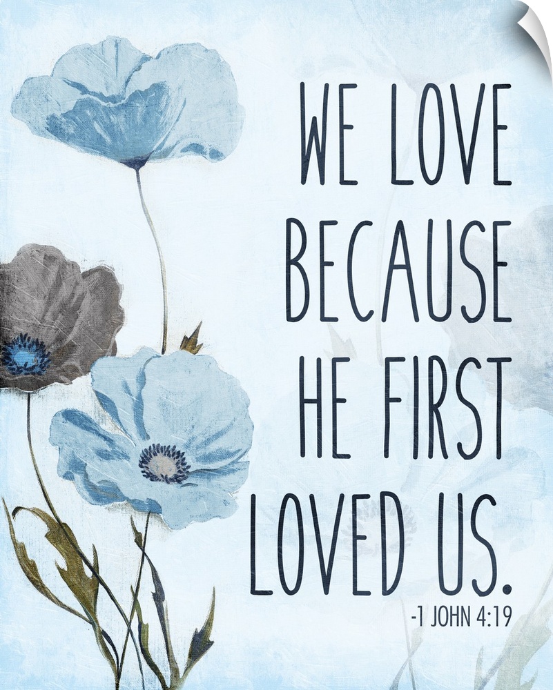 <p>Bible verse 1 John 4:19 with a blue poppy flower design.</p>