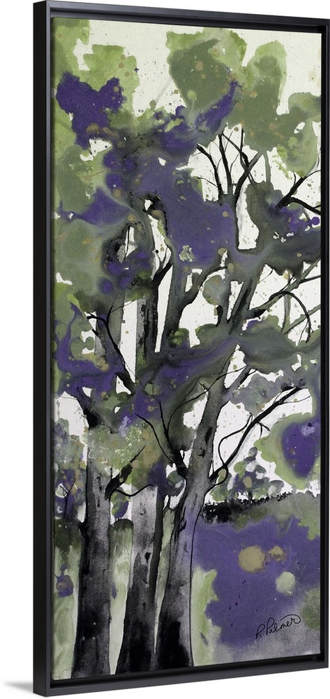 <p>Tall panel abstract painting resembling trees with black and gray trunks and purple and green bushy leaves and grass.</p>