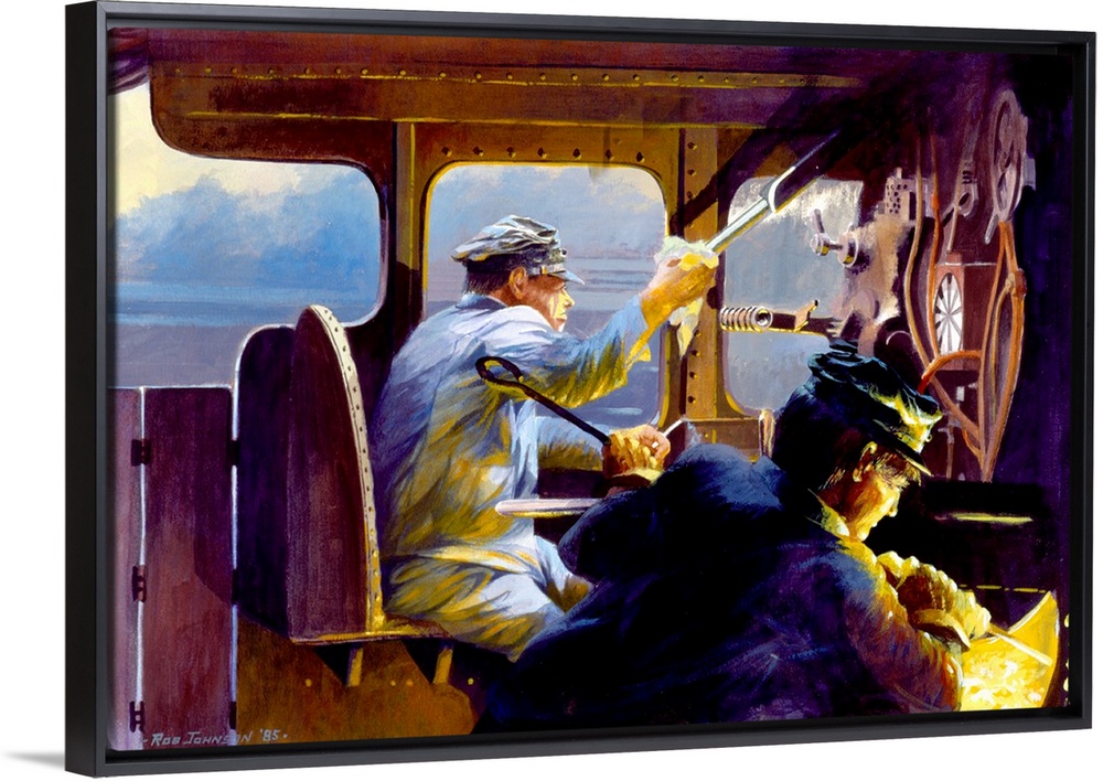 <p>Contemporary painting train engineers driving a steam engine.</p>