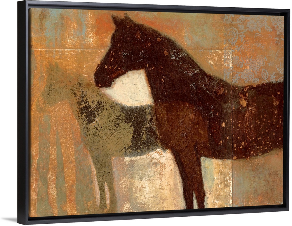 <p>Contemporary painting of horse silhouettes covered in paint splatters with floral design in one color.</p>