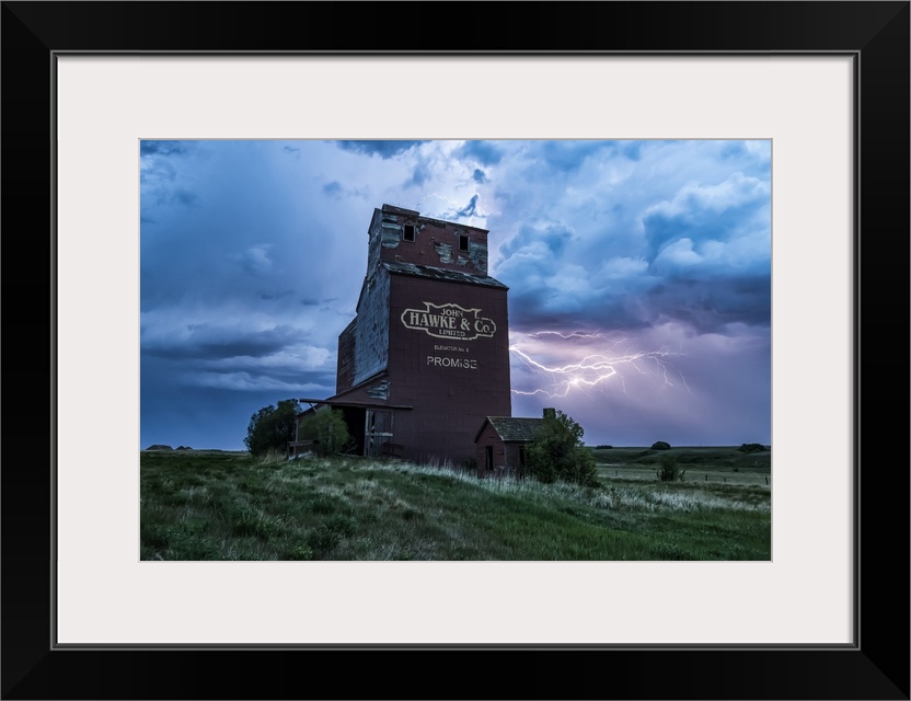 <p>Weathered grain elevator and electrical storm on the prairies; Saskatchewan, Canada</p>