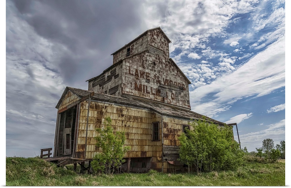 <p>Weathered grain elevator on the prairies; Elva, Manitoba, Canada</p>