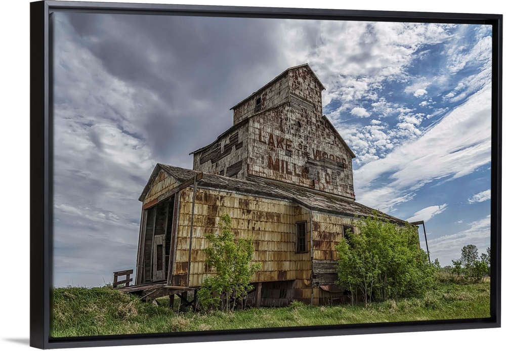 <p>Weathered grain elevator on the prairies; Elva, Manitoba, Canada</p>