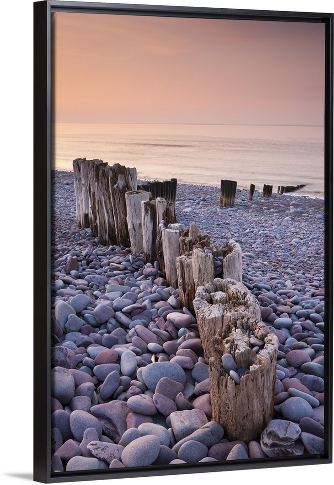 <p>Weathered wooden groyne on Bossington Beach at sunset, Exmoor National Park, Somerset, England. Spring</p>