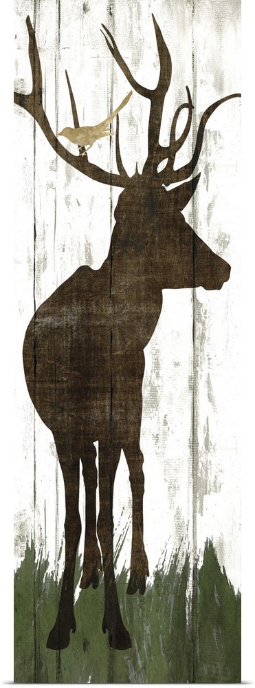 <p>Silhouette of a deer with birds in its antlers on a wooden board background.</p>