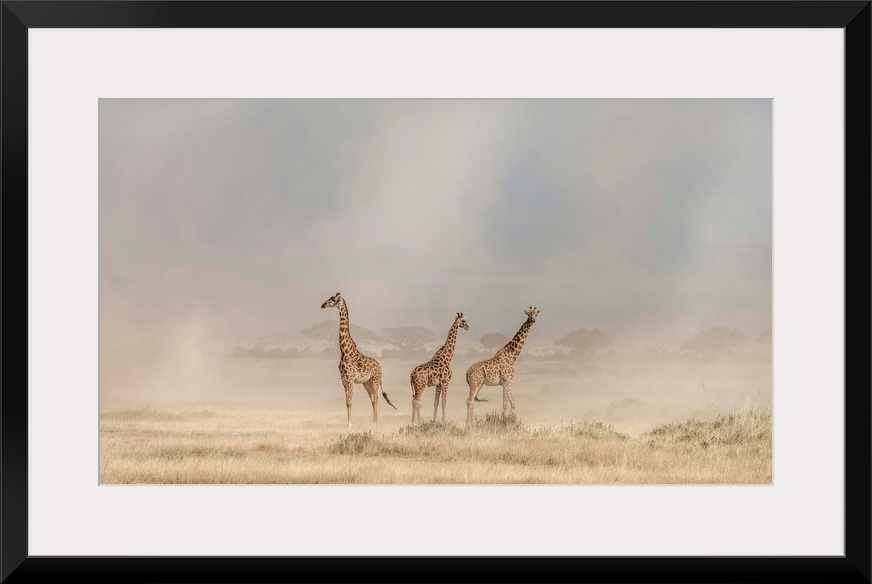 <p>Photograph of three giraffes surrounded by the desert dust.</p>
