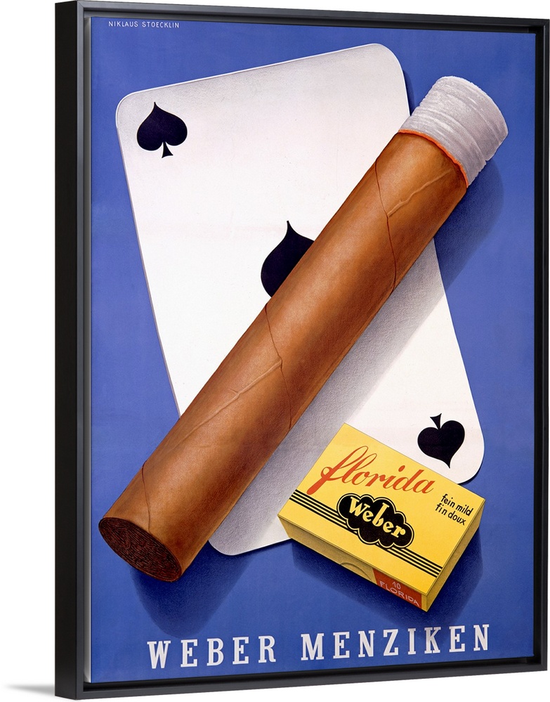 <p>Vintage poster of a lit cigar and match box placed over a card of spades.</p>