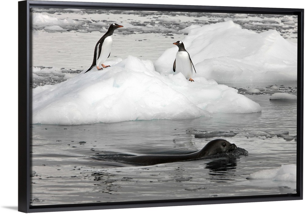 <p>Neko Harbor, Antarctica. A Weddell Seal swims past two Gentoo penguins standing on an iceberg.</p>