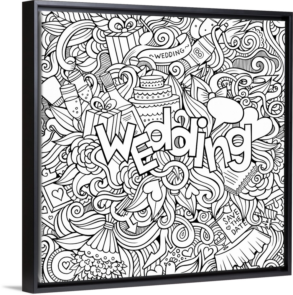 <p>A series of wedding-themed objects, such as cake, rings, and hearts.</p>