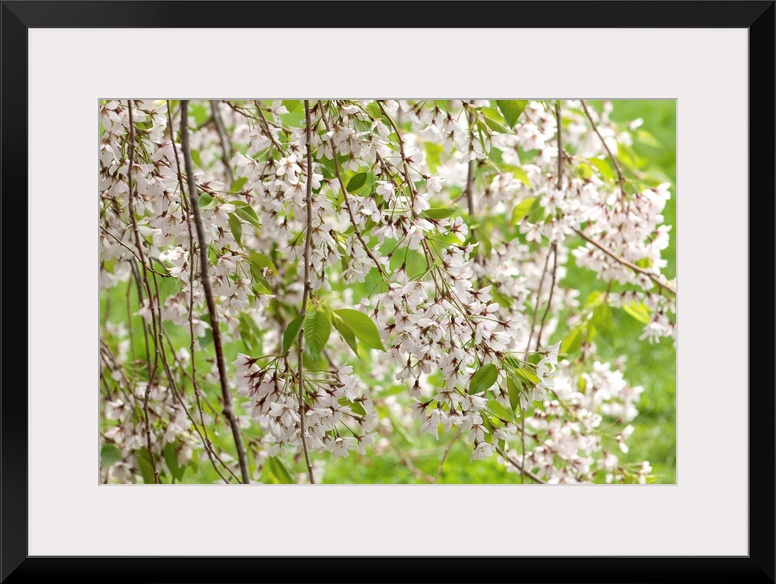 <p>Weeping cherry blossoms and branches, Prunus species, in springtime.</p>
